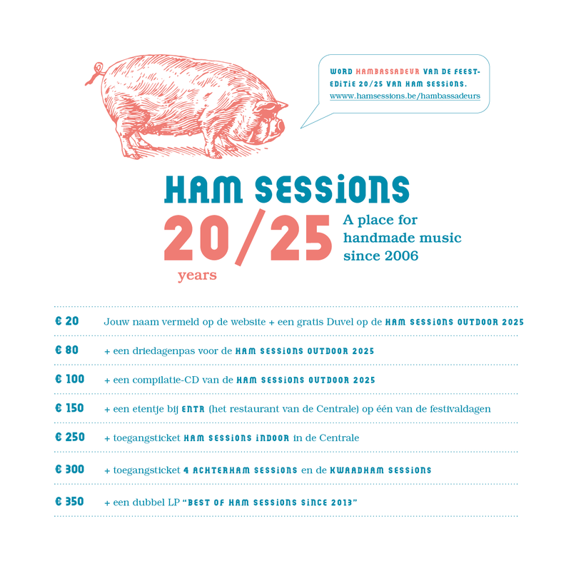 maak het gekozen bedrag over op de TRIODOS-rekening van Ham Sessions vzw – BE05 5230 8096 5975 – met vermelding ‘Hambassadeur 20/25‘.
